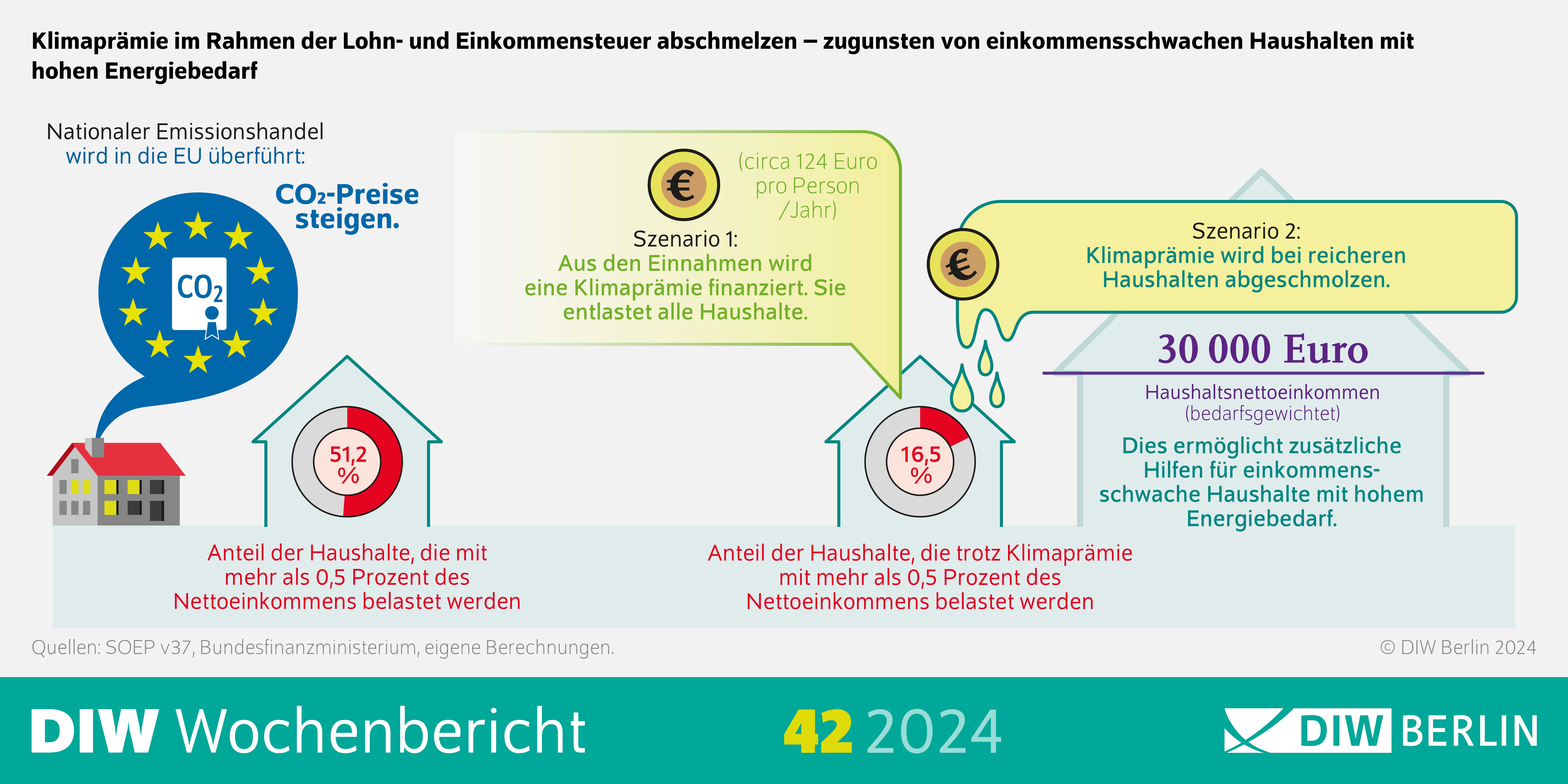 Übergang vom nationalen zum europäischen Emissionshandel ab 2027 dürfte Preise für Kohlendioxid (CO2) deutlich erhöhen – Eine Klimaprämie kann die Belastungen durch die CO2-Bepreisung für die deutschen Haushalte deutlich mildern, wirkt aber regressiv – Klimaprämie sollte im Rahmen der Lohn- und Einkommensteuer bei höheren Einkommen abgeschmolzen werden