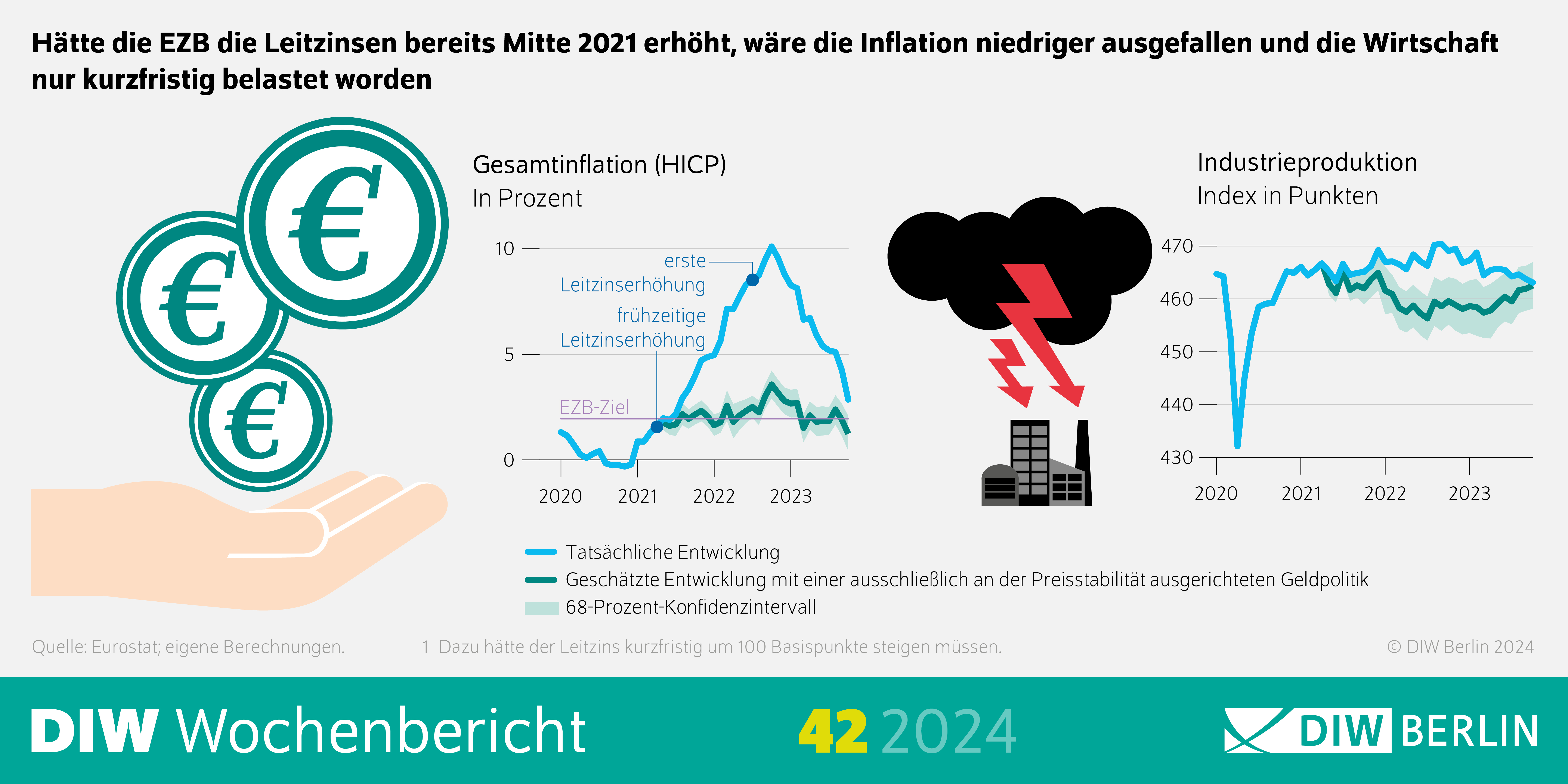 Die Europäische Zentralbank (EZB) hätte die Inflation in den Jahren 2021 bis 2023 mit einer früheren Leitzinserhöhung schneller und effektiver in den Griff bekommen können. Die Wirtschaft im Euroraum hätte sich gemessen an der Industrieproduktion zwar schlechter entwickelt, wäre aber nur kurzfristig noch stärker belastet worden. Dies ist das Ergebnis einer aktuellen Studie des Deutschen Instituts für Wirtschaftsforschung (DIW Berlin). Forscher der Abteilung Makroökonomie haben modellbasiert berechnet, wie sich Inflation und Wirtschaft entwickelt hätten, wenn die EZB die Zinsen früher und stärker erhöht hätte, um ihrem Primärmandat der Preisstabilität besser gerecht werden zu können.