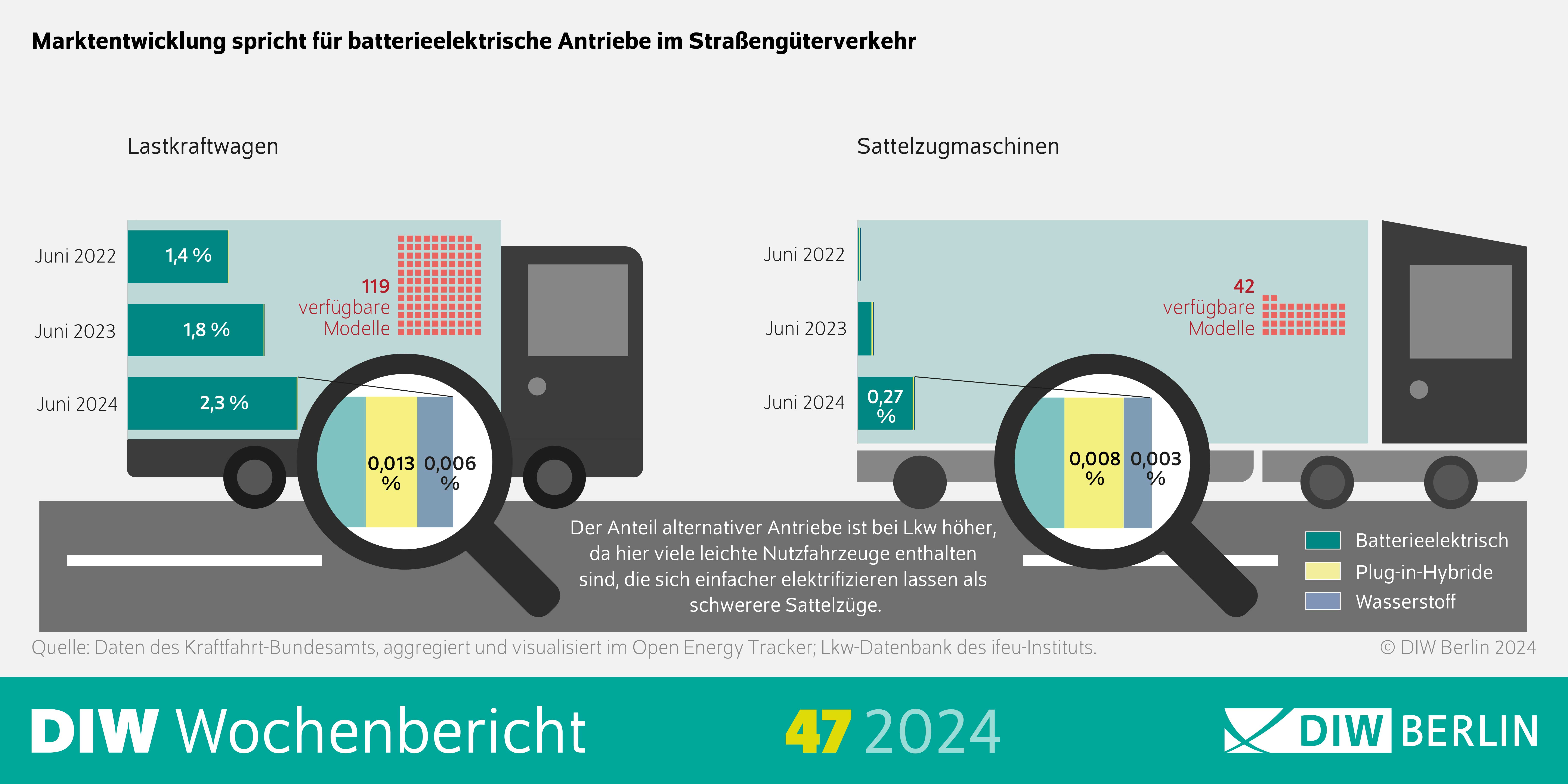 Die Studie zeigt, dass sowohl der Bestand als auch die Zahl verfügbarer Modelle batterieelektrischer Lkw in Deutschland zuletzt deutlich gestiegen sind, wenn auch von einem niedrigen Niveau aus. Bei Wasserstoff-Lkw ist eine solche Entwicklung nicht zu beobachten. Zudem investiert die Privatwirtschaft derzeit erheblich in den Ausbau der Ladeinfrastruktur für Elektro-Lkw. Um möglichen Herausforderungen bei den Netzanschlüssen zu begegnen, könnten ergänzend auch Batteriewechsel- oder Oberleitungssysteme weiter erprobt werden.