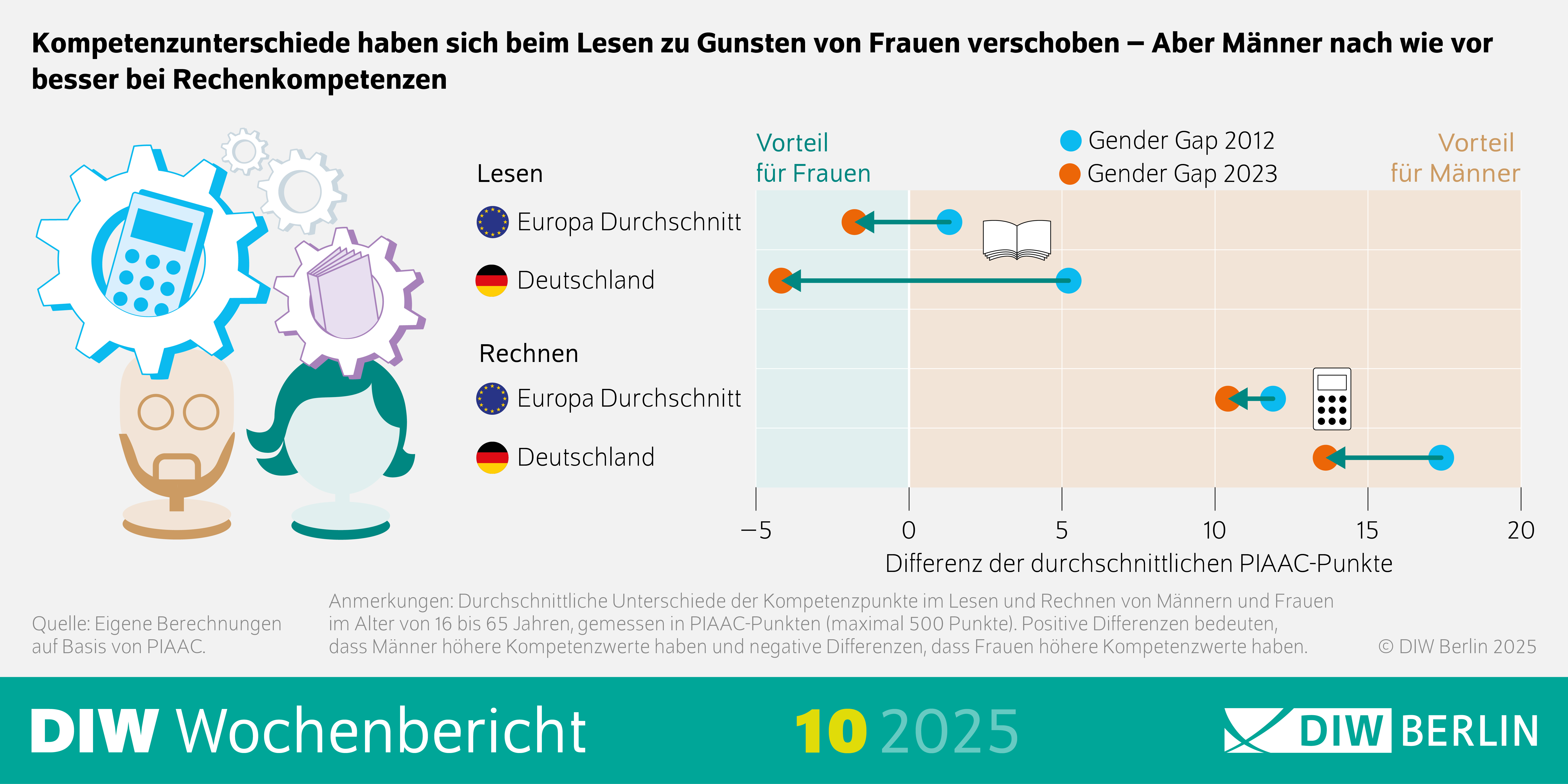 In einer zweiten Studie wurde mithilfe von Daten des Programme for the International Assessment of Adult Competencies (PIAAC) der Zusammenhang zwischen geschlechtsspezifischen Kompetenzunterschieden und dem Gender Pay Gap untersucht. Demnach unterscheiden sich die Grundkompetenzen, wie Lesen und Rechnen, zwischen Männern und Frauen in Deutschland teils erheblich. Mittlerweile weisen Frauen hierzulande im Durchschnitt eine höhere Lesekompetenz auf als Männer. Männer schneiden hingegen nach wie vor besser bei Rechenkompetenzen ab – und das über alle Altersgruppen (von 16 bis 65 Jahren) hinweg. Die Ergebnisse zeigen aber auch: Die Lohnlücke zwischen Frauen und Männern können diese Unterschiede nur minimal erklären. „Um echte Chancengleichheit zu erreichen, müssen wir bereits in der Schule ansetzen und Stereotype in der Berufswahl aufbrechen – etwa durch eine gezielte Förderung von Mädchen in MINT-Fächern und von Jungen in sprachlichen Bereichen“, erklärt Studienautorin Lavinia Kinne aus der Forschungsgruppe Gender Economics des DIW Berlin, die die Studie gemeinsam mit Jonas Jessen vom Wissenschaftszentrum Berlin für Sozialforschung (WZB) und Frauke Witthöft vom ifo Institut in München erstellt hat.