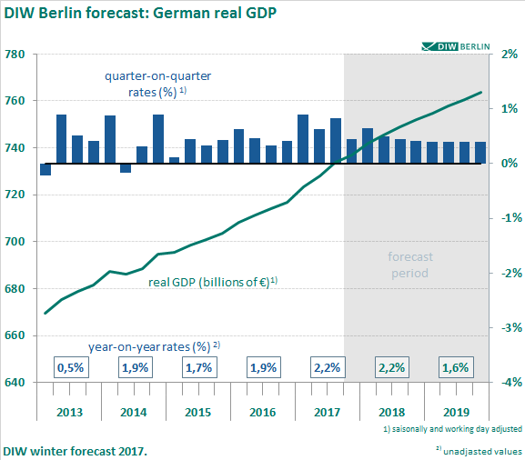 The German Institute for Economic Research (DIW Berlin) is raising its forecast compared to the fall, partly because the first half of 2017 was more robust than currently documented in the official statistics. The German economy is expected to grow by 2.2 percent this year and next. The growth rate will likely be somewhat lower again in 2019: around 1.6 percent. In September, the growth forecast for this year and next was 1.9 percent; for 2019 the forecast remains unchanged.
