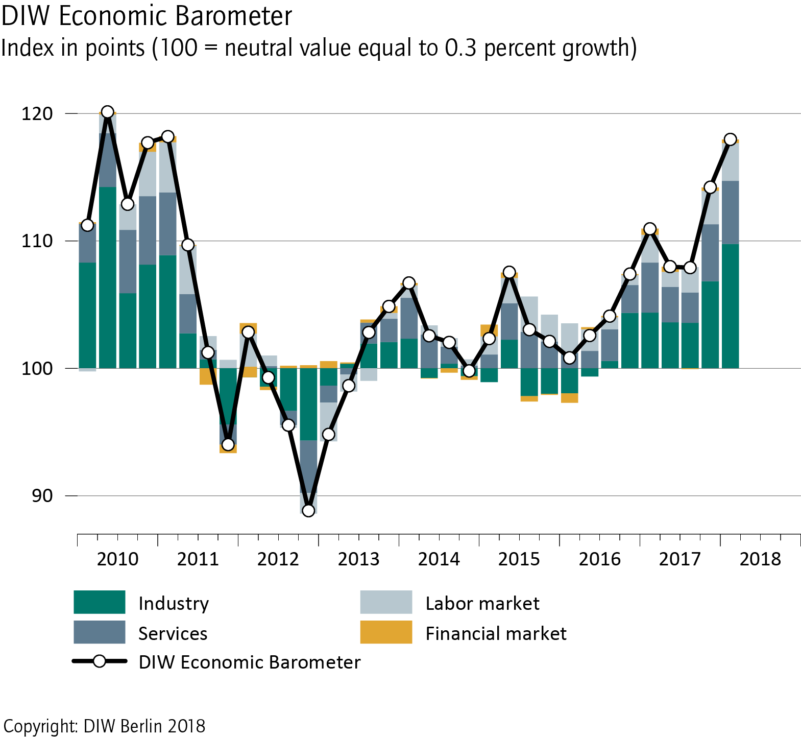 The German economy continues to soar: the German Institute for Economic Research’s (DIW Berlin) Economic Barometer is at its highest reading in seven years. The index score for the first quarter landed at 118 points, an increase of almost four points compared to the last quarter of 2017. The Economic Barometer is thus well-above the 100-point mark that corresponds to the long-term average growth of 0.3 percent. Accordingly, the German economy is likely to grow more vigorously in the winter—by an estimated 0.7 percent in the first quarter of 2018 after a 0.6 percent growth in the fourth quarter of 2017, in each case compared to the previous quarter.