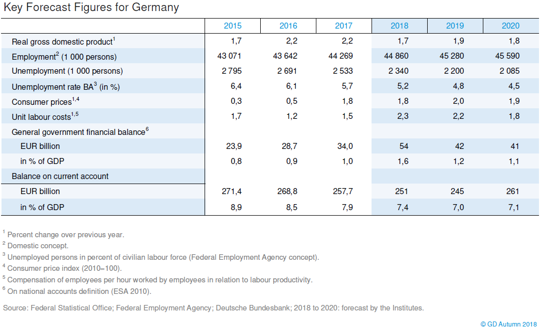 Germany’s leading economics research institutes have downwardly revised their forecasts for 2018 and 2019. They now expect economic output to increase by 1.7 percent in 2018, and not 2.2 percent as forecast in spring. They also scaled back their 2019 forecast slightly from 2.0 to 1.9 percent. These are the results of the Joint Economic Forecast for autumn 2018 that will be presented in Berlin on Thursday.