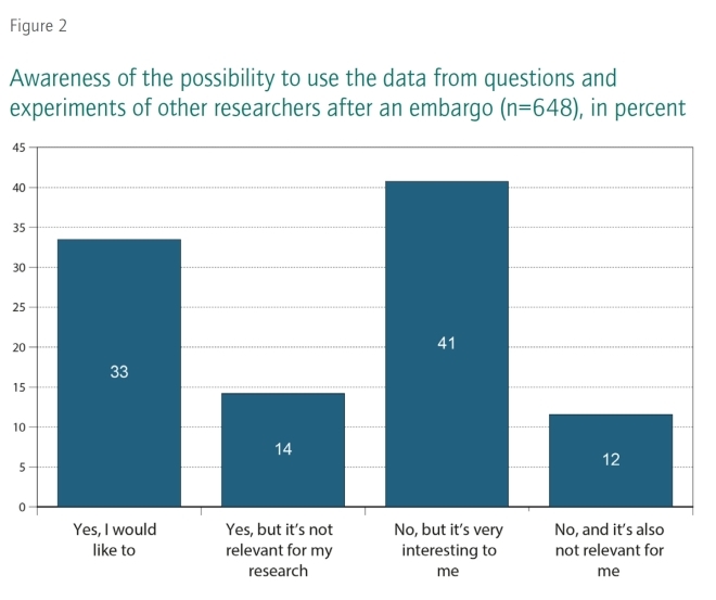 This year, our questionnaire contained a larger group of topics on the awareness of and interest in our SOEP-based studies and their strengths and weaknesses. As a result, we were able to determine that around half of the respondents were not aware of the options that SOEP -IS offers, but found them interesting and would probably use them in the future (see Figures 1 and 2). This included the option of proposing questions and experiments for SOEP-IS, or evaluating other researchers’ questions and experiments after a suitable hiatus period. The survey also showed that many respondents are interested in the IAB-BAMF-SOEP Survey of Refugees in Germany and using the dataset available in November 2017 (see Figure 3).