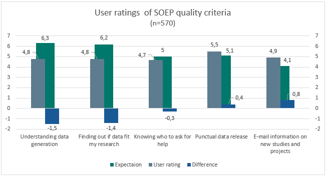 This year, SOEP User Survey respondents were asked to rate the SOEP on a series of quality criteria (Figure 1) using a seven-point Likert scale. We then compared users’ expectations for each criterion with their ratings of the SOEP’s performance. The SOEP exceeded users’ expectations in areas such as punctuality of data release, information on new studies and projects, and the possibility to submit questions to SOEP-IS, and performed below users’ expectations in the area “understandable data generation process”.