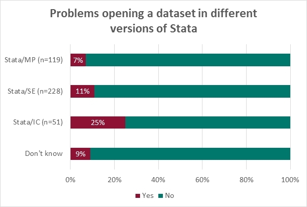 In this section of the survey, we asked data users what technical problems they had experienced, if any, and what hardware and software they needed to be able to work well with the SOEP data. The majority of users had no problems opening the SOEP datasets, but some had difficulties, for instance, processing the numerous variables in our individual long-format dataset in Stata/IC (Figure 1).