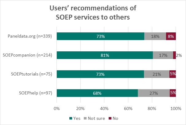 The results of our 2018 User Survey showed a need for improvements in user-friendliness of the data, so over the course of 2019, the SOEP continued developing Getting Started, a toolbox of services designed to facilitate data use for new and returning users. These services include Paneldata.org, SOEPcompanion, SOEPtutorials, and SOEPhelp. In our 2019 User Survey, we invited users to rate these services. We asked whether they knew of each service, whether they had ever used it, and if so, whether they used it regularly or just occasionally. We then asked whether they would recommend each service to others. We only included answers from respondents who had used a service at least once. The survey results show that a large majority of SOEP data users would recommend our Getting Started services to others.