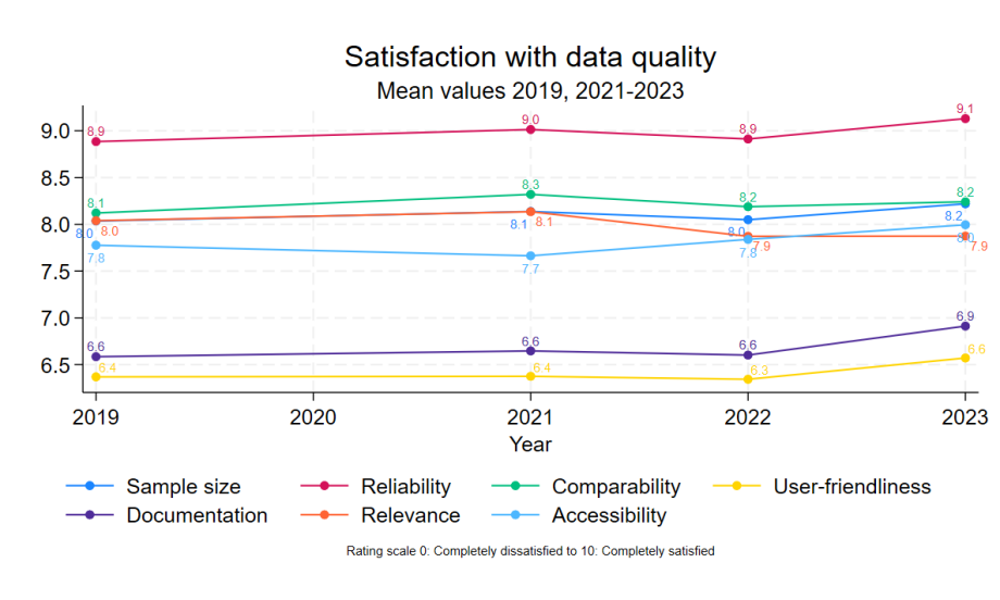 Figure 5: Satisfaction with aspects of data quality compared to previous years (mean values 2019, 2021-2023)
