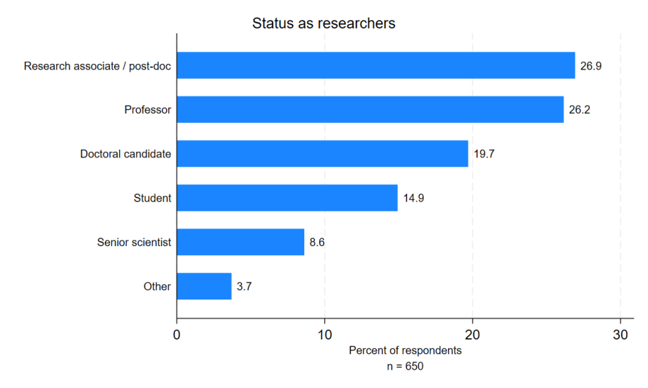 Research staff and post-doctoral students made up one third of all respondents to the user survey, while the percentage of professors has declined since last year. This has been accompanied by a decline in the use of SOEP data in teaching (from 69% in 2014 to 61% in 2015).