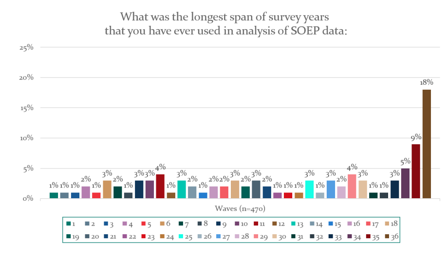 This year, we asked for the largest time span that users have ever evaluated in a relevant analysis. Almost 1/5 of users use all 36 waves, meaning the time span between 1984 and 2019 (Figure 3). 9% of all users have worked with 35 waves, and 34 waves are used by 5% of participants. Less than 5% of respondents use a time span less than 33 years. This indicates that for the majority of users all 36 waves are relevant for working with SOEP data.