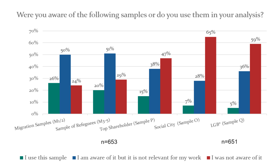 Another topic this year was the knowledge or use of special samples. The most frequently used samples by our users are the migration sample M1/2 and the sample for refugees M3-5 (Figure 4). Both samples attract a lot of interest. The samples Social City and LGB* are presumably more relevant for specific questions and are thus used less on their own.