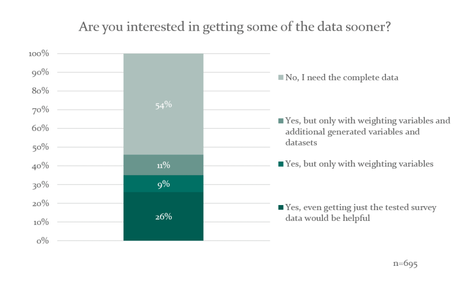 Because of this relatively long wait, we were especially interested in finding out how users would feel about getting the data sooner. Overall, the results show that our users are not completely in agreement: 46% would like to get the data earlier (Figure 2). Of these, 11% would find it helpful to get the data along with weighting variables and additional generated data, 9% would like the data with weighting variables only, and 26% would like just the checked data. More than half of data users are not interested in receiving the data earlier and are quite willing to wait. (see Figure 2).