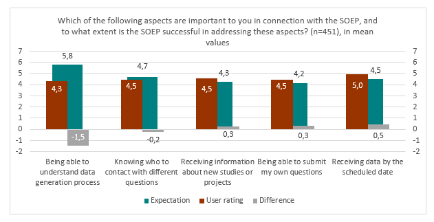 As in 2017, our 2018 User Survey asked users to rate the SOEP on specific quality criteria (Figure 3). Again using a seven-point Likert scale, users first rated how important each of the quality criteria was to them, and then evaluated the SOEP’s current performance in each area. The results show that users place the highest importance on understanding the process of data generation and on getting a quick idea of whether SOEP data would fit their research project. Both categories show a negative difference between expectations and realities. The SOEP is exceeding users’ expectations in the punctuality of data releases and in the e-mail information sent out to users about new SOEP studies and projects.