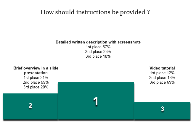To identify potential problems faced by first-time SOEP data users, this year’s survey asked respondents what subjects they would like to have covered in the SOEP’s instructional materials (Figure 2). Users were asked to think back to the first time they worked with the SOEP data and rate (on a seven-point Likert scale) how useful an instructional manual on specific topics would have been at that time, and whether the currently available instructional materials are sufficient. Respondents rated instructions on how to find the history of questions and variables (mean: 5.6) and understand the meaning of terms for datasets and variables (mean: 5.6) as extremely important. They reported having problems especially in “finding the history of questions and variables,” and felt that the available information (mean: 4.6) should be expanded. In the area “survey instruments and their contents,” the information provided by the SOEP met users’ expectations. Users rated detailed written descriptions with screenshots as their preferred form of instructional materials (Figure 3).