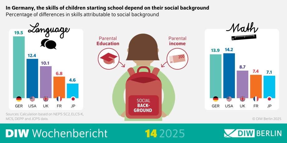 Infographic for Dräger, J. and T. Schneider (2025): Sprach- und Mathekompetenzen hängen in Deutschland bei Schulstart stärker von sozialer Herkunft ab als in anderen Ländern. DIW- Wochenbericht 14/2025, 209-215. Video-Interview with Jascha Dräger (DIW) on Youtube (only in German). (Audio-)Interview with Jascha Dräger (DIW) (only in German).