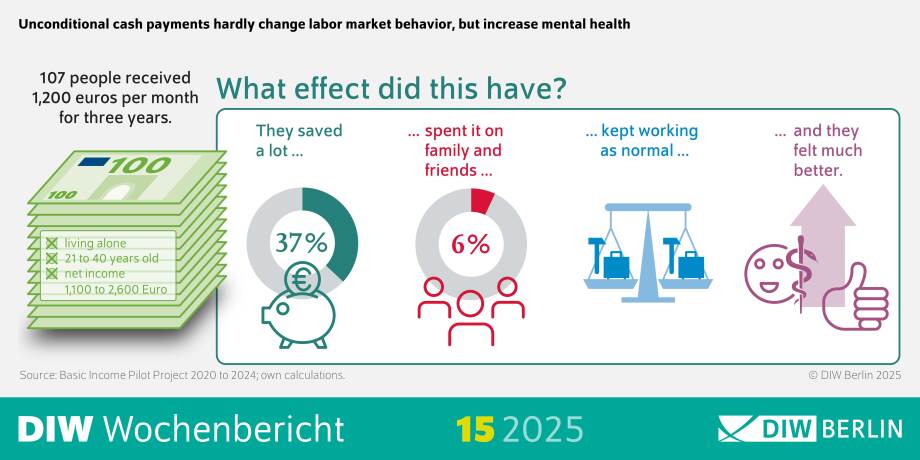 However, the payments led to a significant improvement in mental health and an increase in general life satisfaction as well as other indicators of well-being. The results, presented in DIW-Wochenbericht 15/2025 (only in German) (PDF, 428.84 KB), provide an evidence-based building block for objectifying the socio-politically relevant debate on unconditional cash payments.